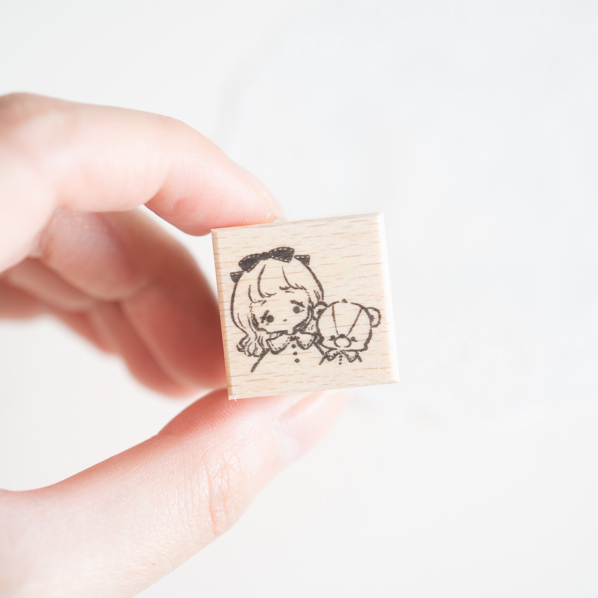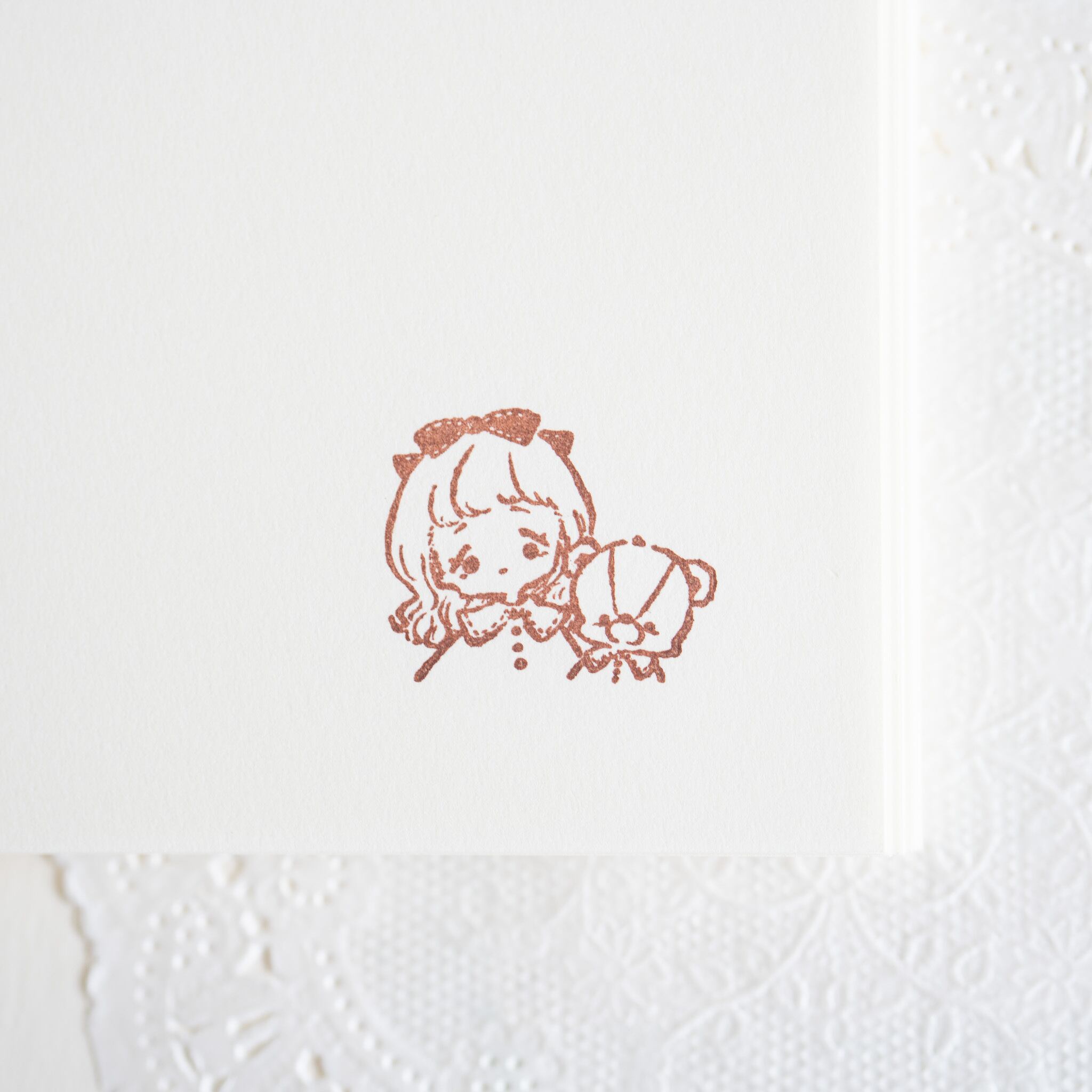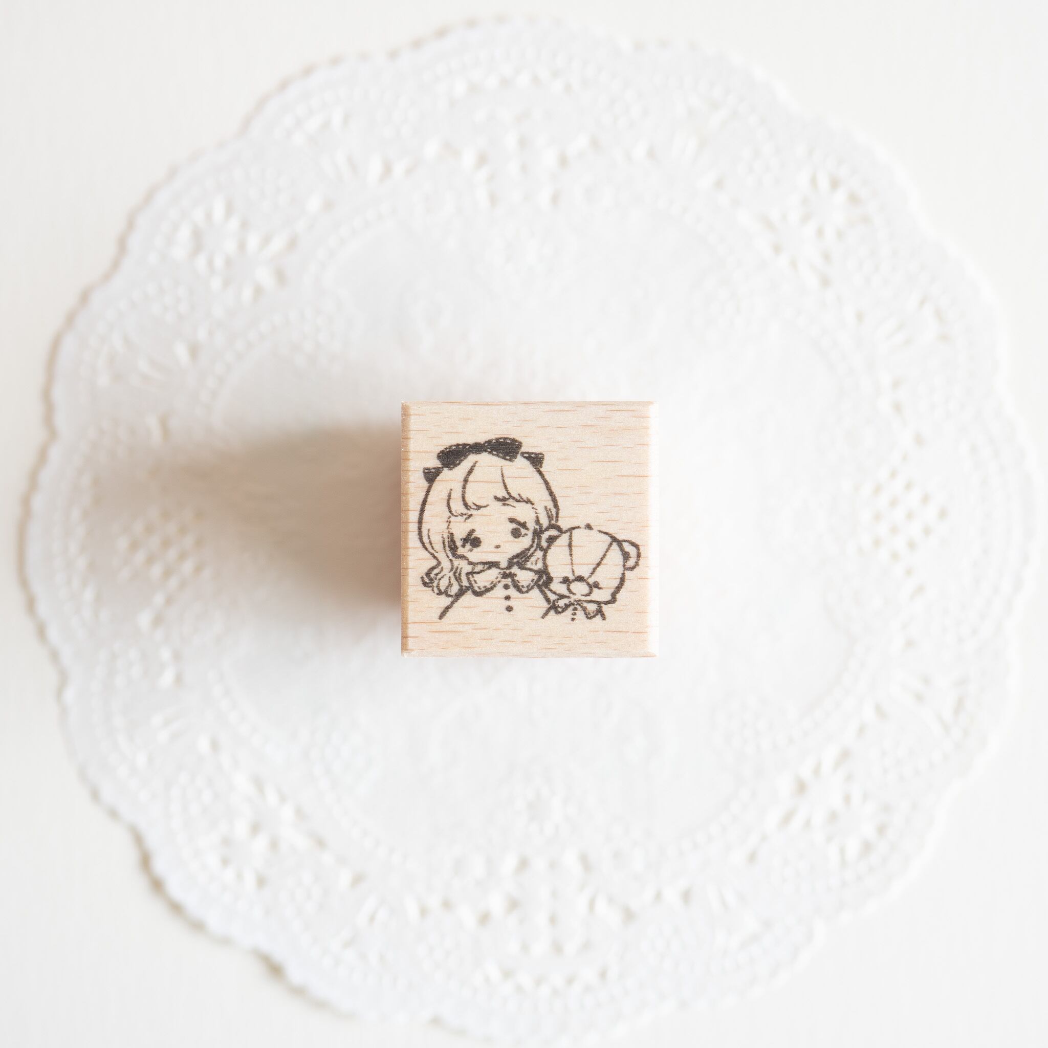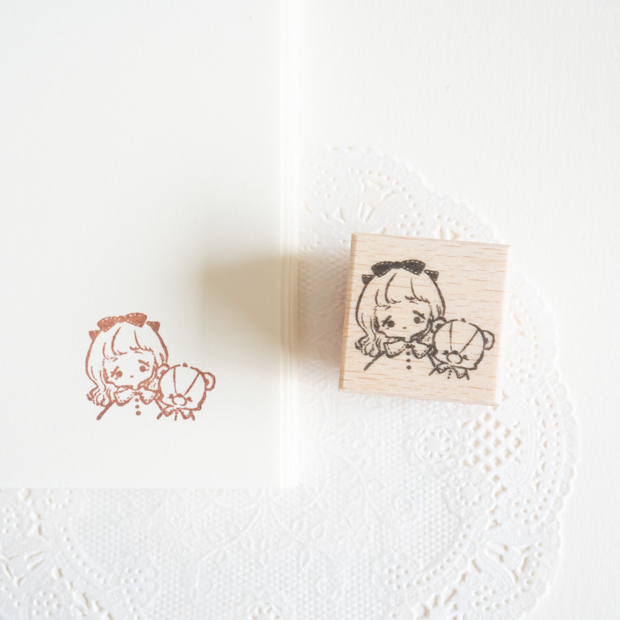 お揃いの服を着た女の子とテディベアが寄り添う、小さめサイズのラバースタンプです。