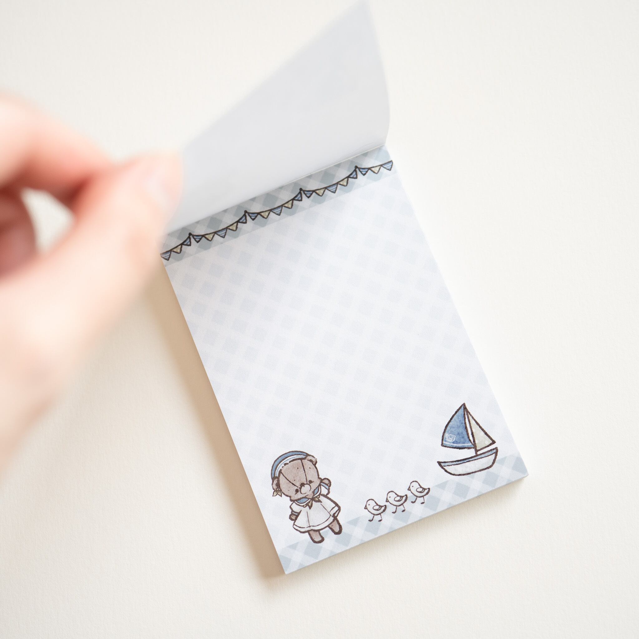 セーラー服を着たテディベアの、海をイメージしたデザインのメモ帳。