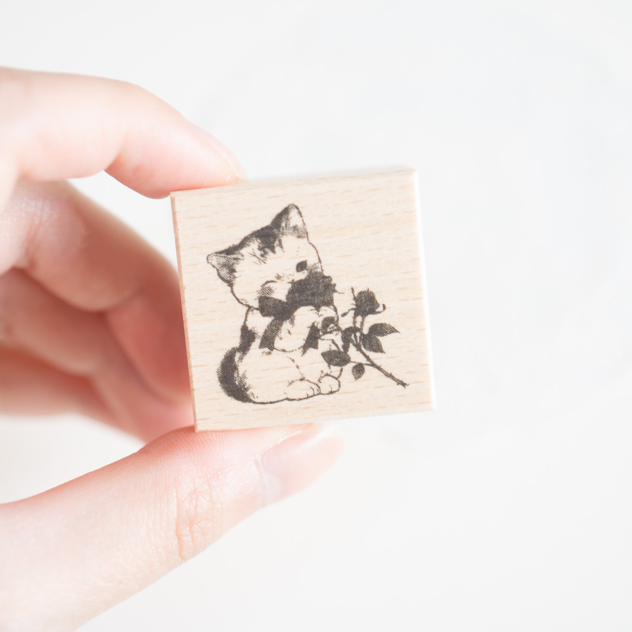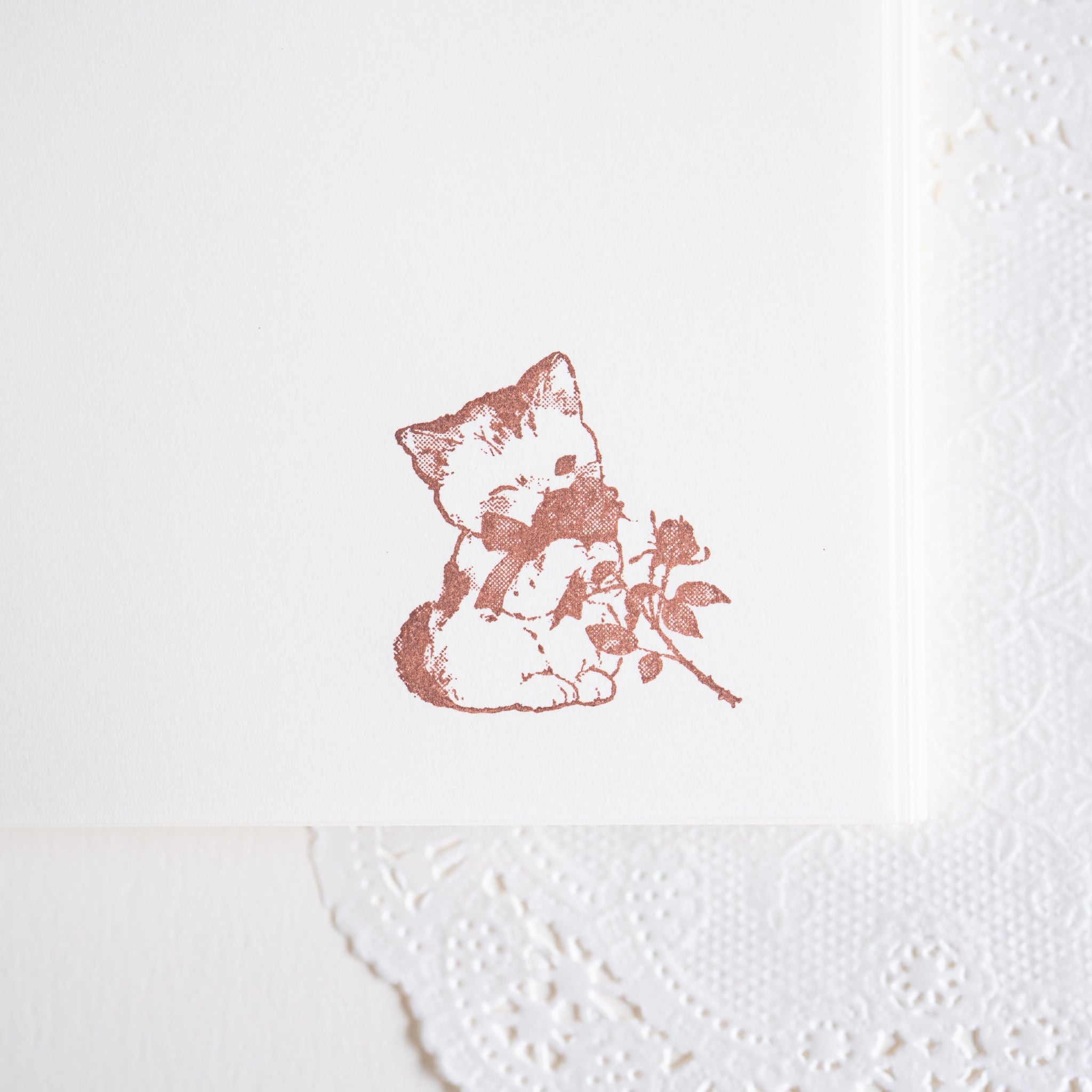 薔薇の花をそっと抱きしめる、ちいさな子猫のラバースタンプです。