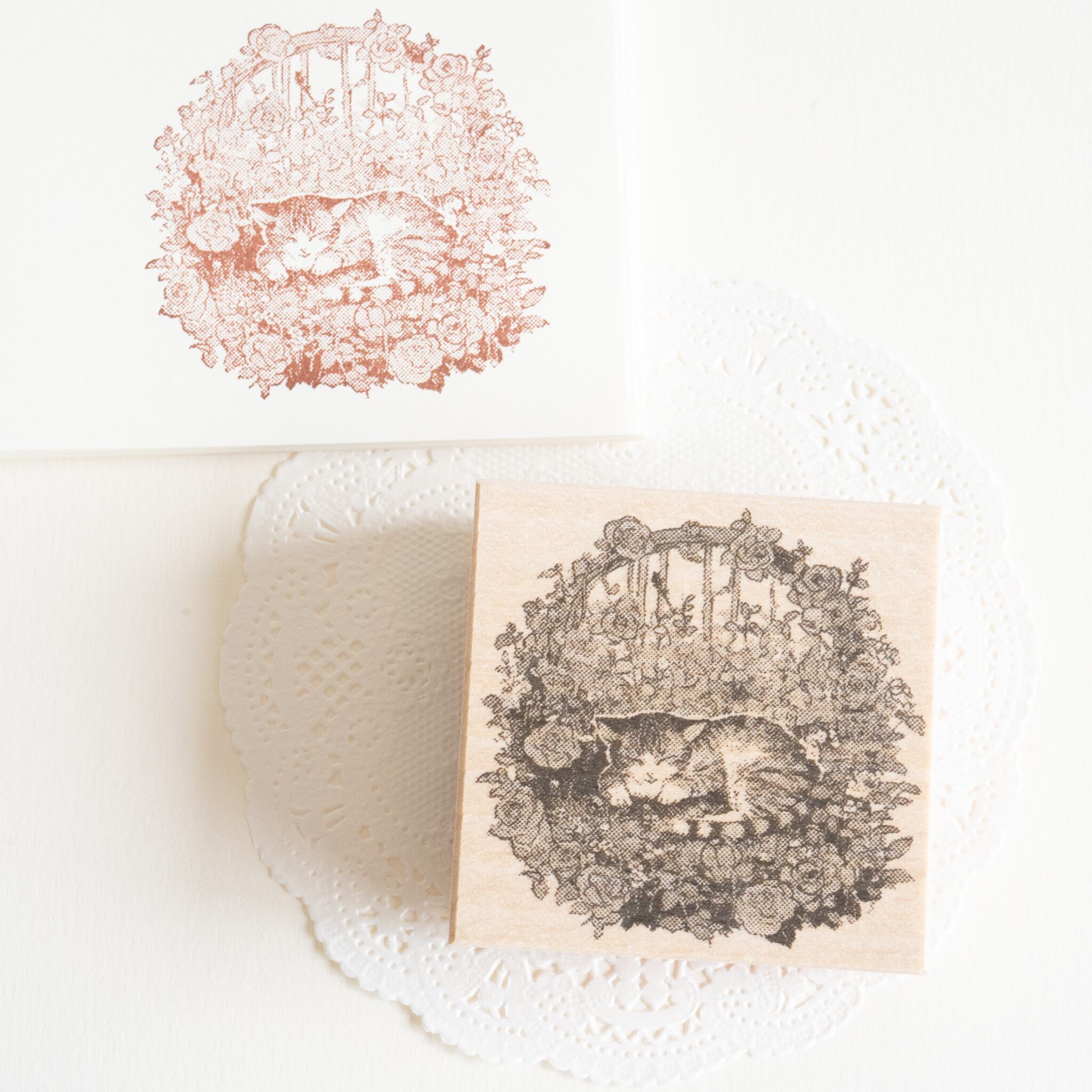 ローズガーデンですやすやと眠る猫のラバースタンプです。