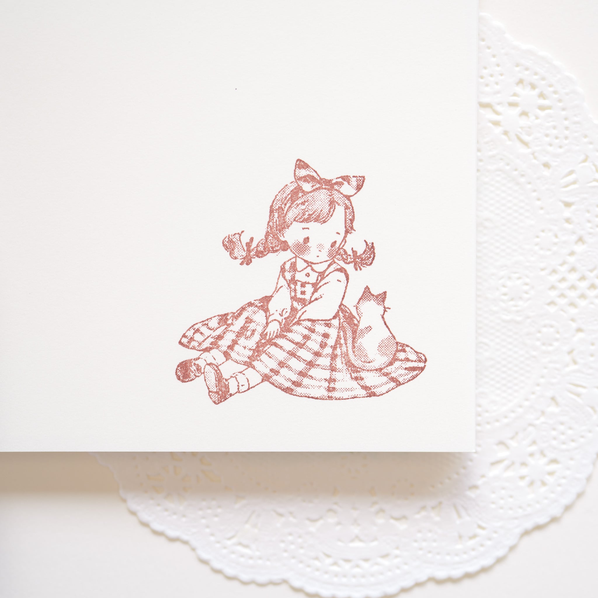 座る女の子と寄り添う猫を描いた、やさしい雰囲気のラバースタンプです。