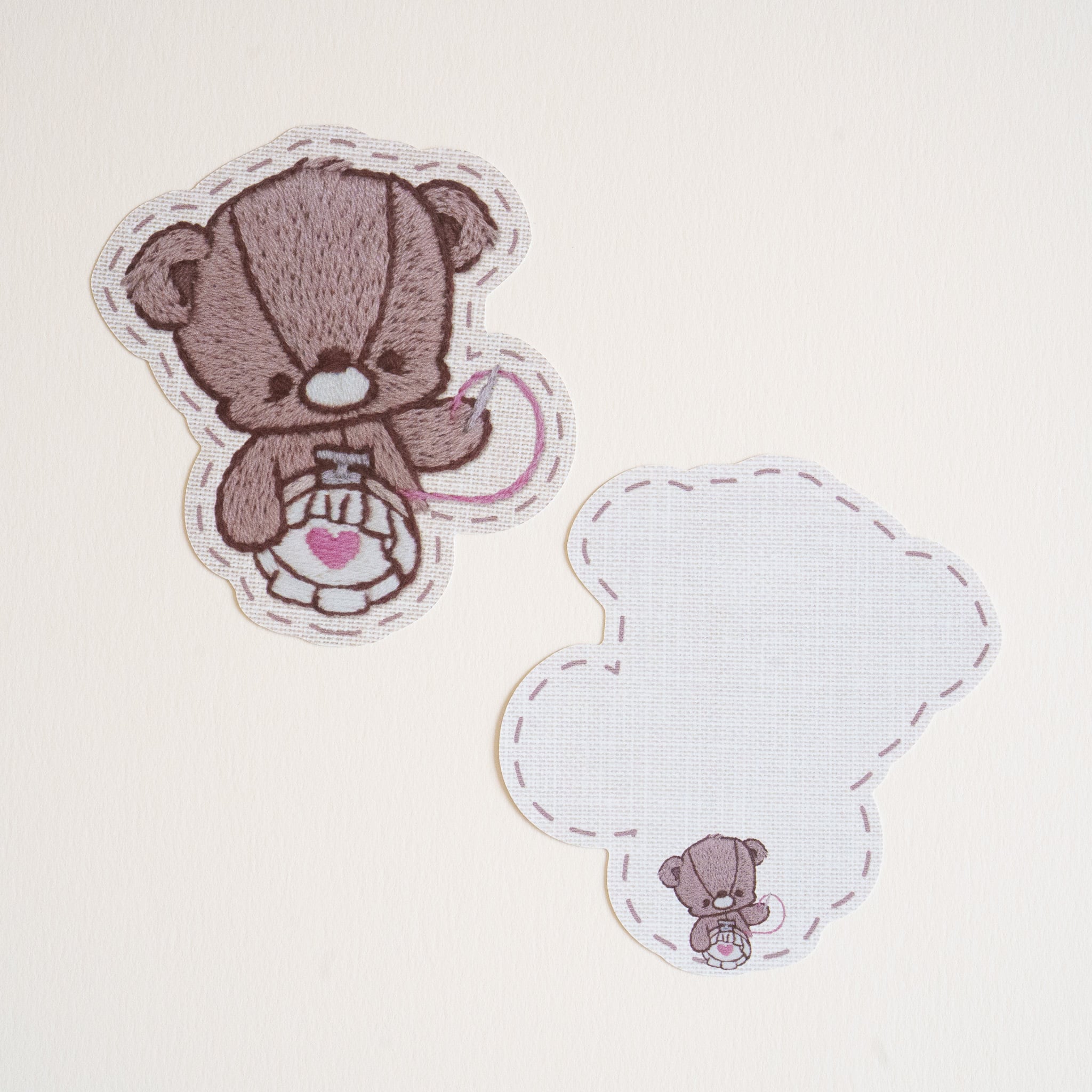 ダイカットメモ - ワッペン風メモ 刺繍をするテディベア / 刺繍イラストNo.14 【Sweet painting】