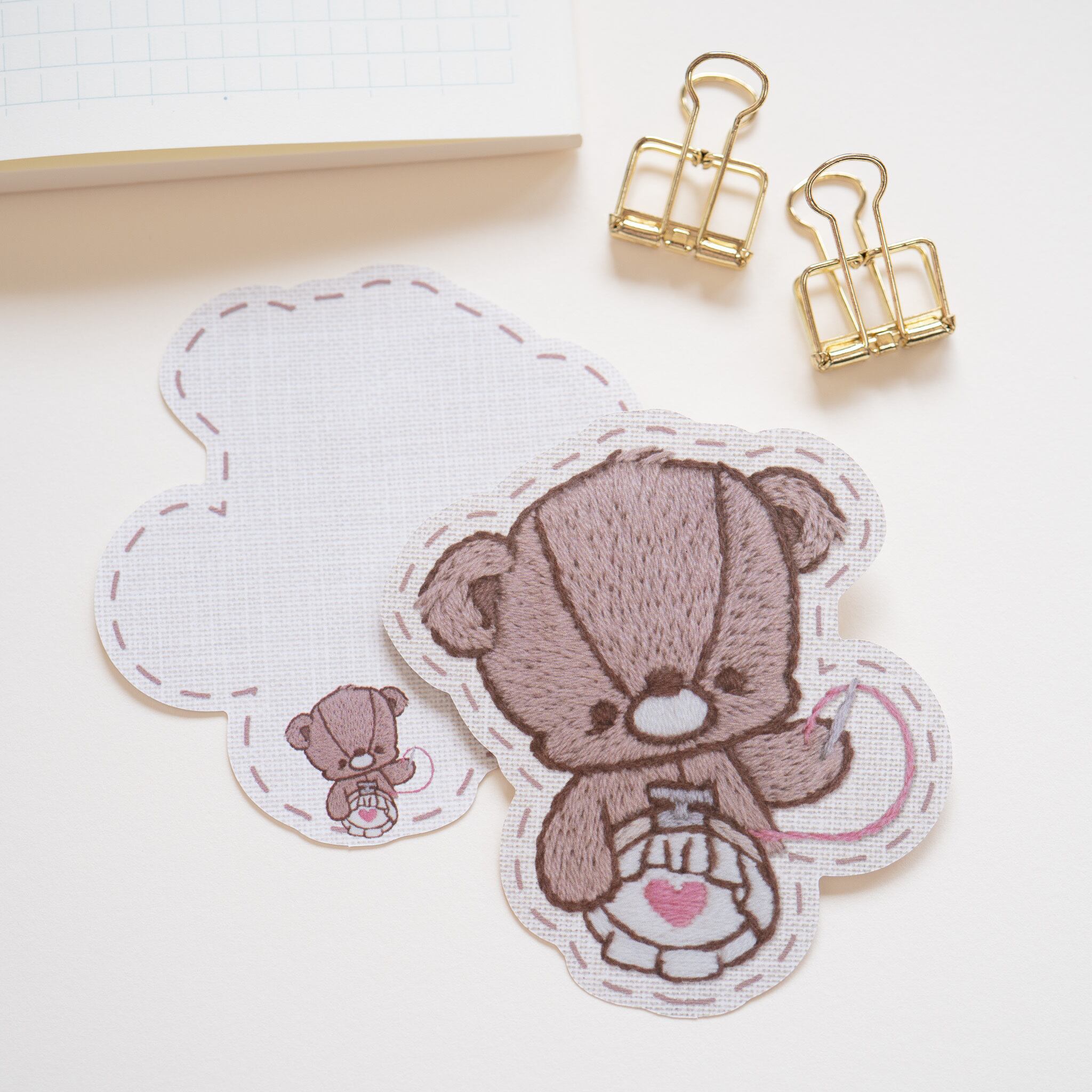 「刺繍をするテディベア」をテーマに手刺繍で描いたテディベアのイラストをダイカットメモにしました。