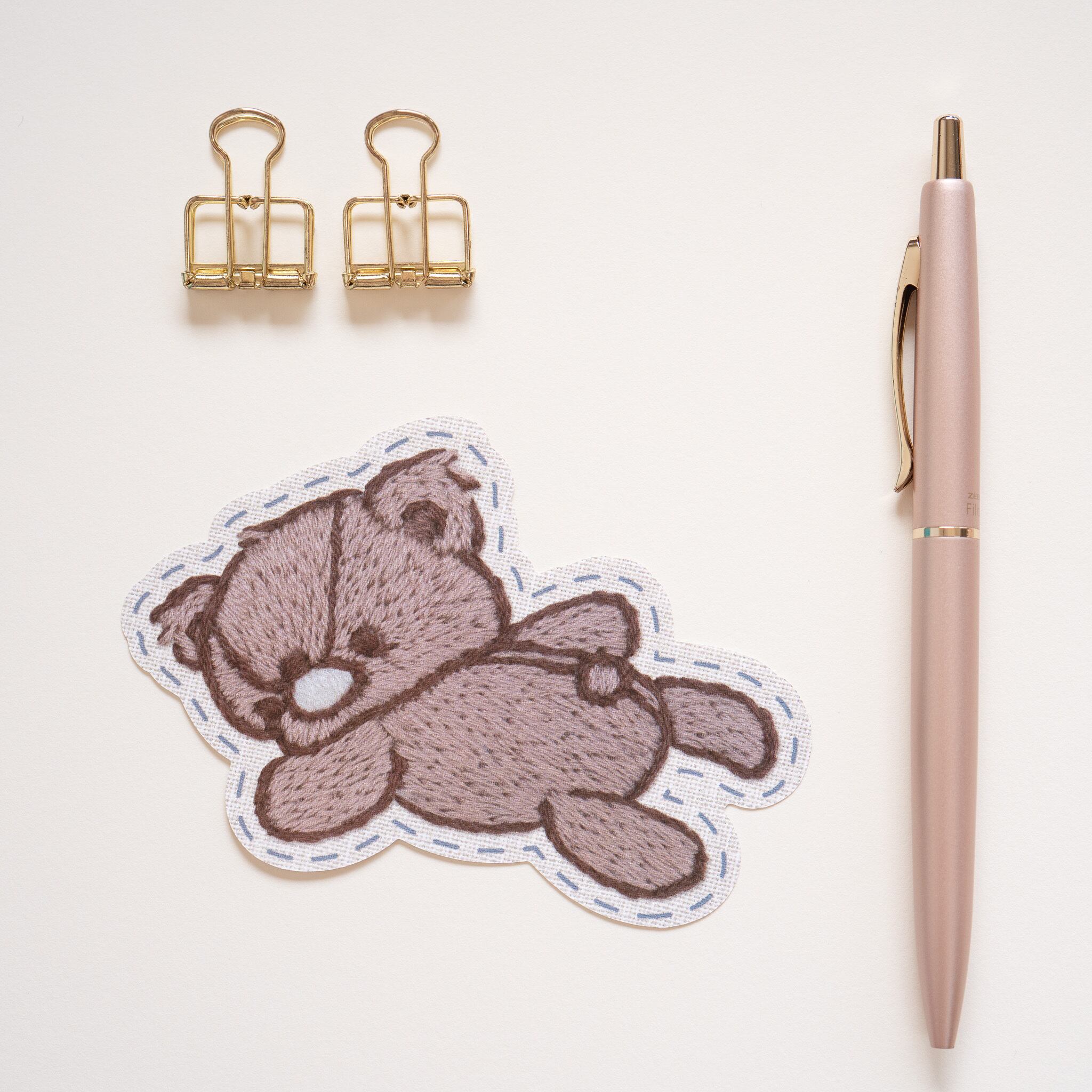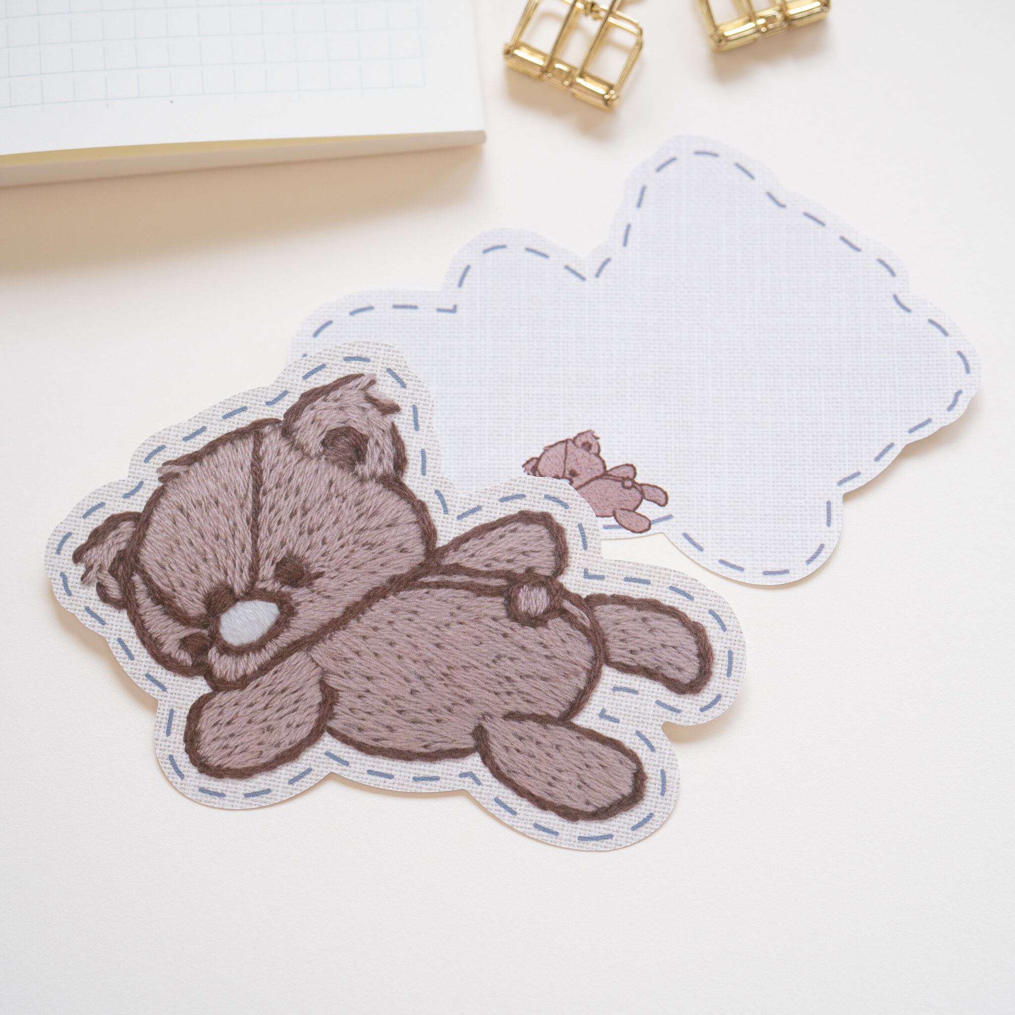 「寝そべるテディベア」をテーマに手刺繍で描いたテディベアのイラストをダイカットメモにしました。
