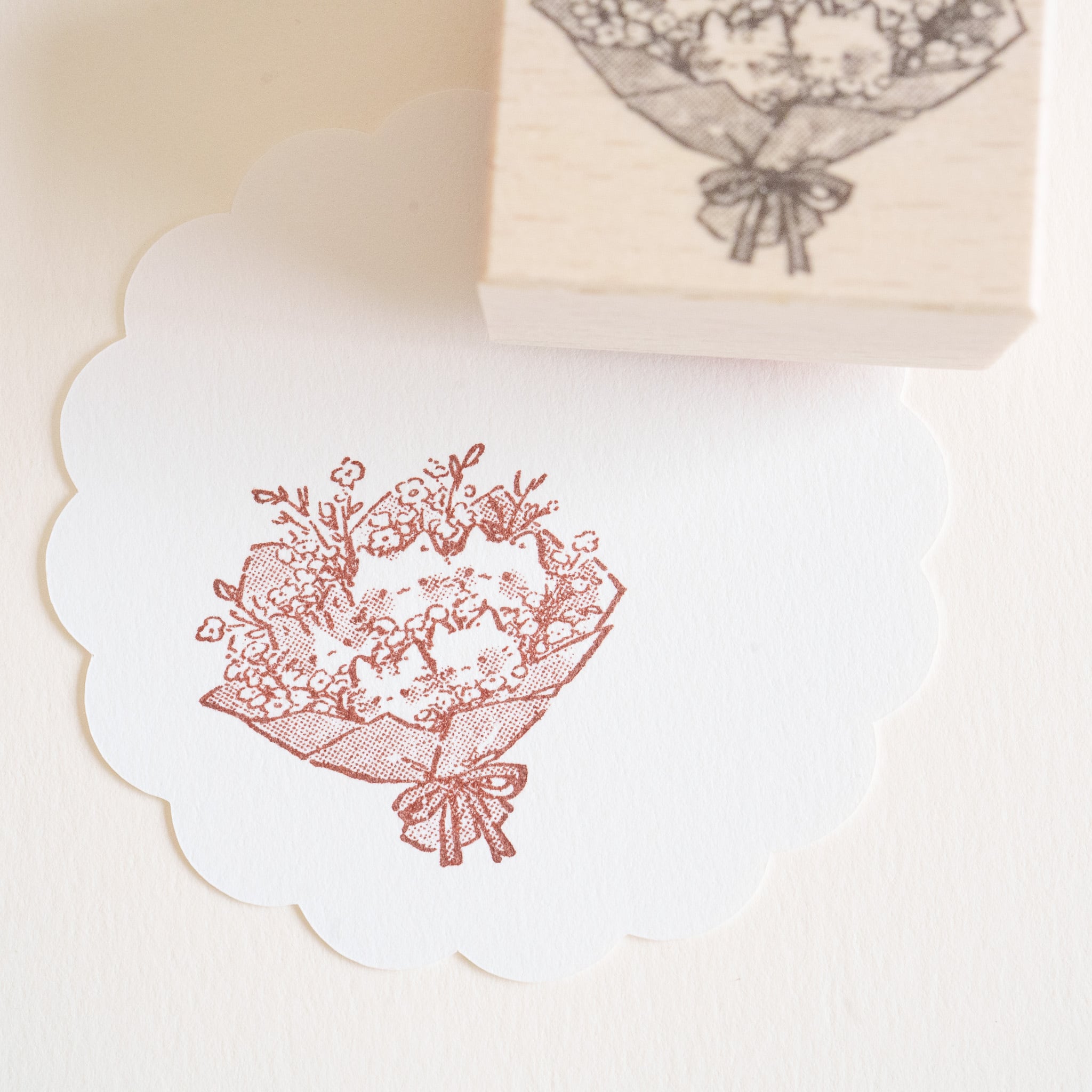 小さなお花を束ねた花束の中に、子猫たちがちょこんと顔をのぞかせるラバースタンプです。