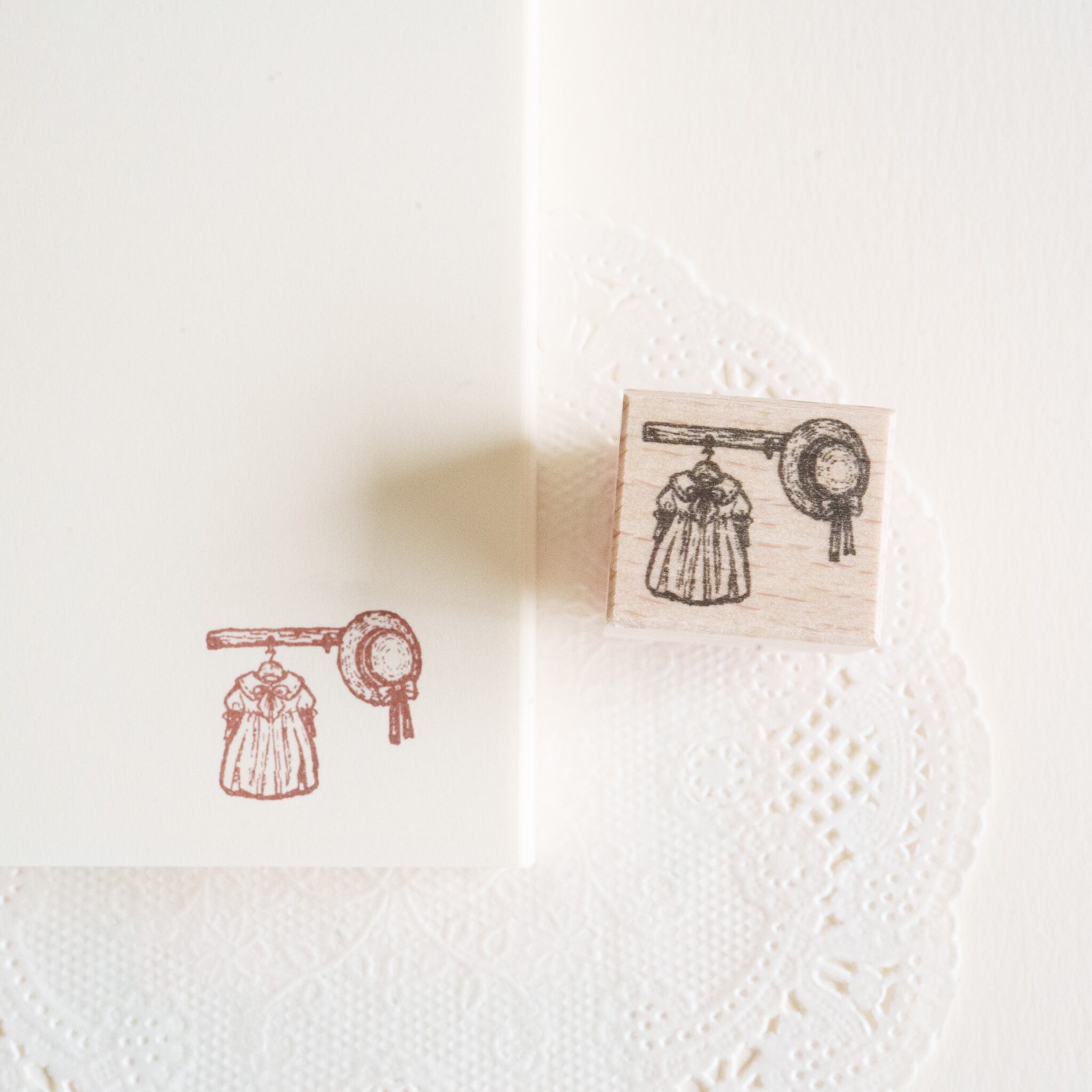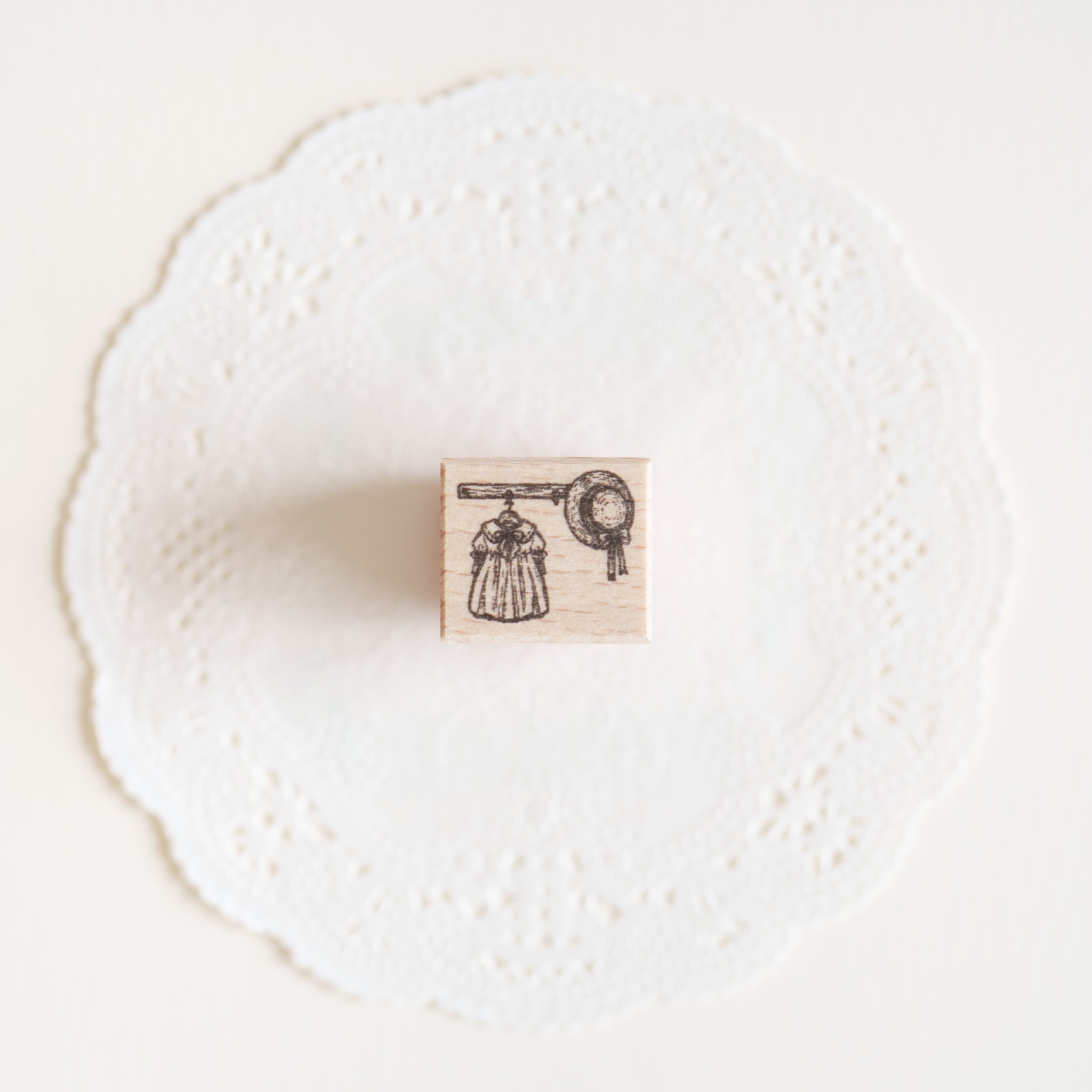 ワンピースと帽子が掛けられた、壁付けのウォールハンガーのラバースタンプです。