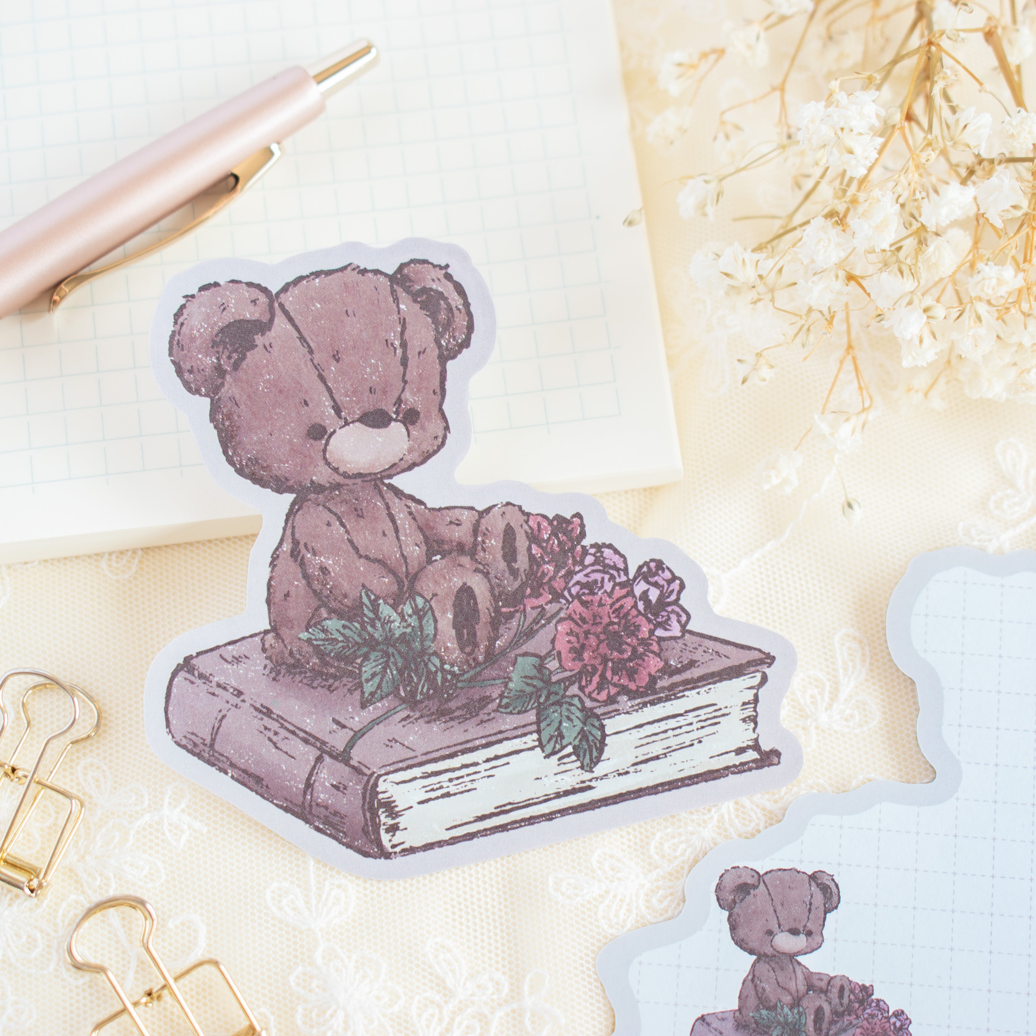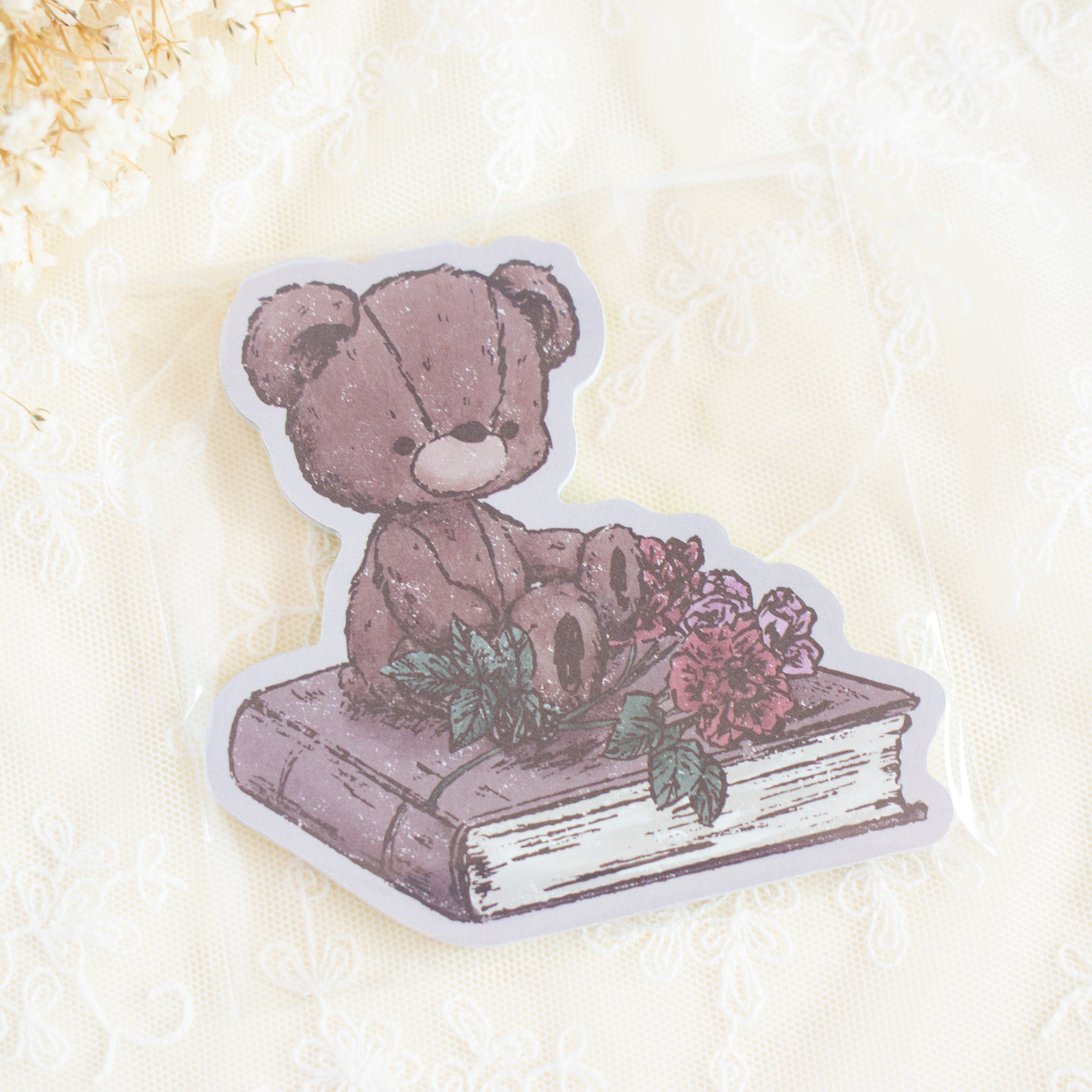 本とお花、テディベアをレトロタッチに描いたダイカットメモです。