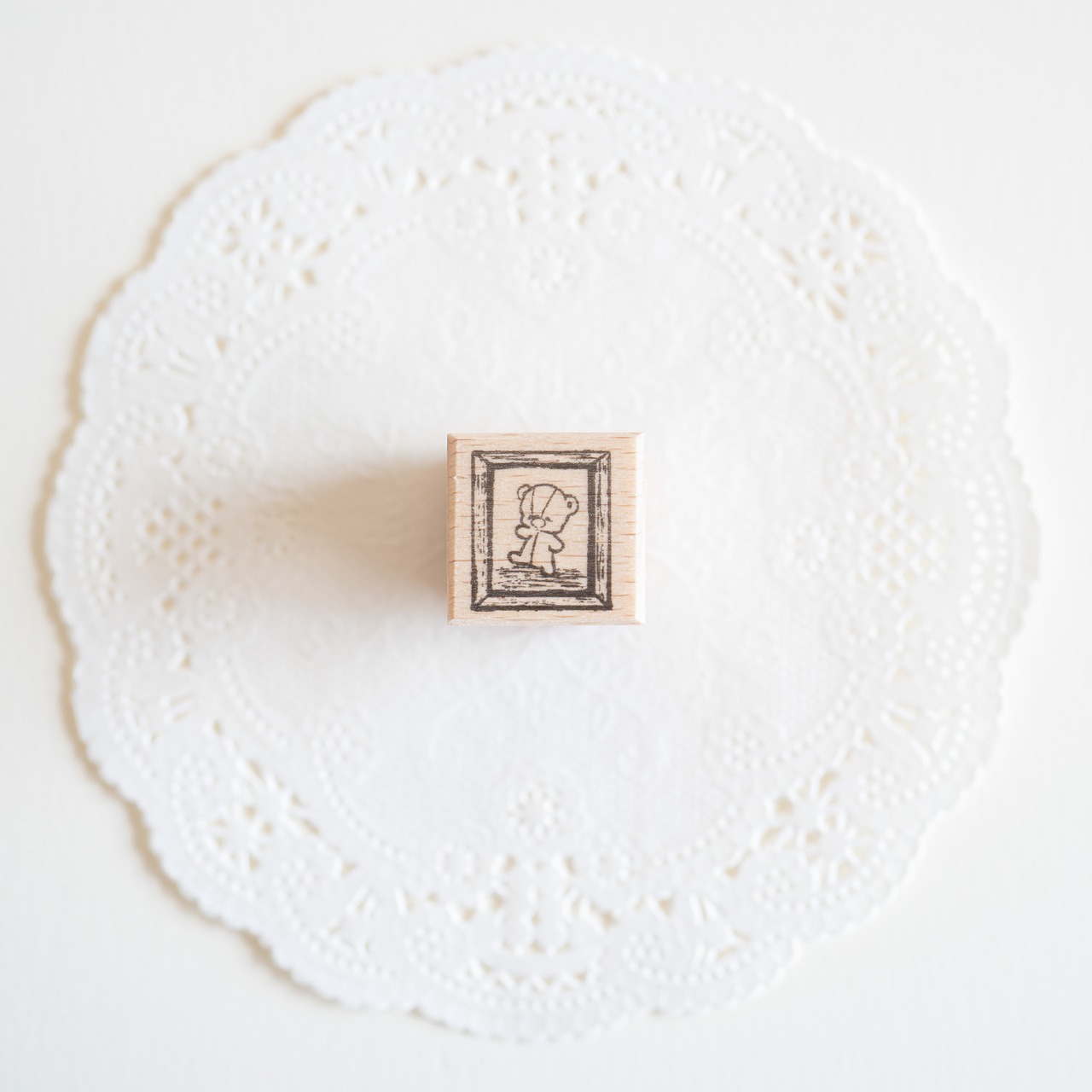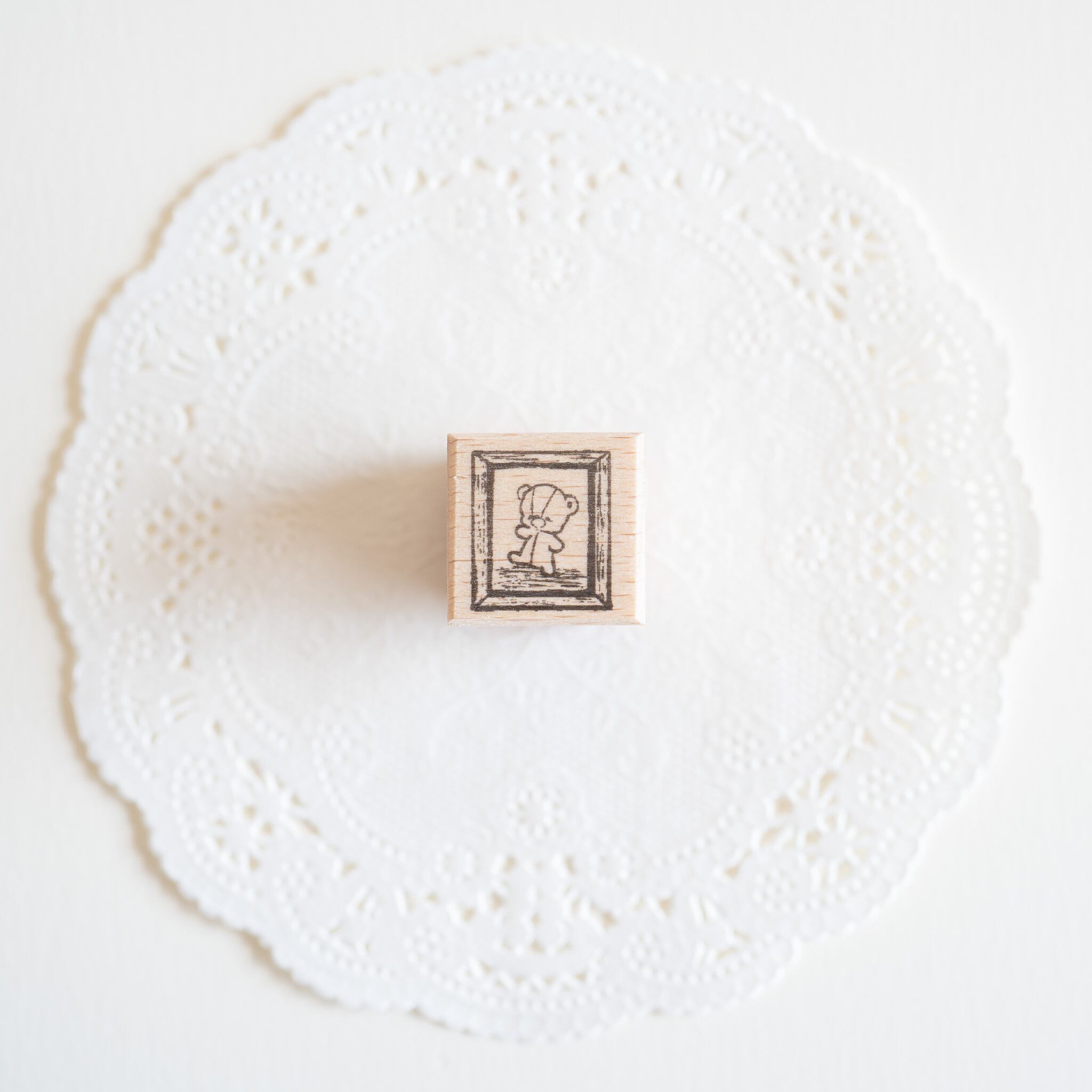 テディベアの写真を飾った木製フォトフレームをイメージした、小さなサイズのラバースタンプです。